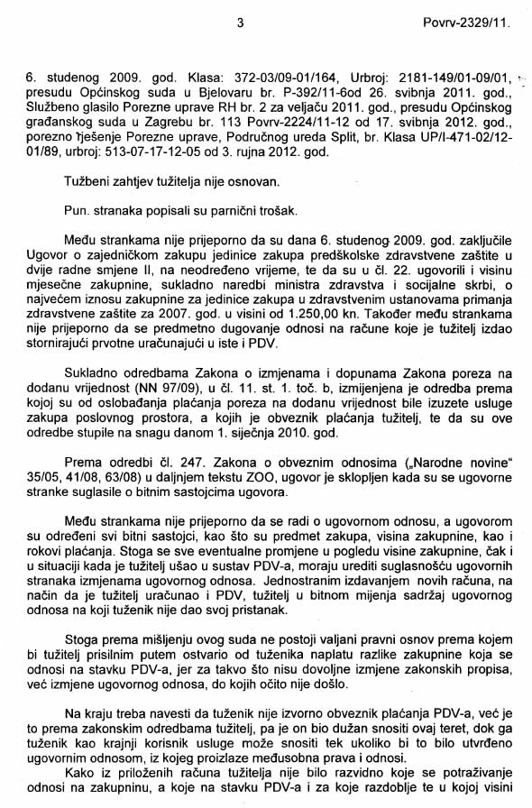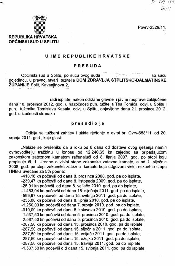 Nepravomoćna presuda Općinskog suda u Splitu u postupku kojeg je pokrenuo Dom zdravlja Splitsko-dalmatinske županije vezano za isplatu razlike zakupnine na ime PDV. Protiv navedene presude Dom zdravlja ima pravo žalbe.