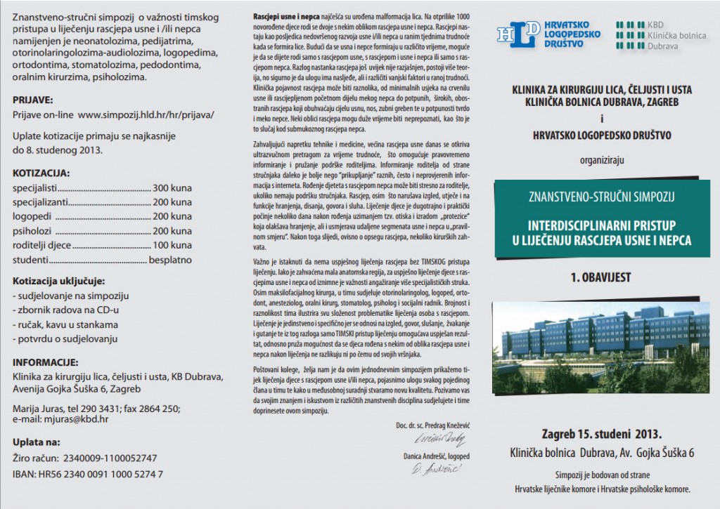 Poštovani kolege, želja nam je da ovim jednodnevnim simpozijem prikažemo tijek liječenja djece s rascjepom usne i/ili nepca, pojasnimo ulogu svakog pojedinog člana u timu te kako u međusobnoj suradnji stvaramo novu kvalitetu. Pozivamo vas da svojim znanjem i iskustvom iz različitih znanstvenih disciplina sudjelujete i time doprinesete ovom simpoziju.
