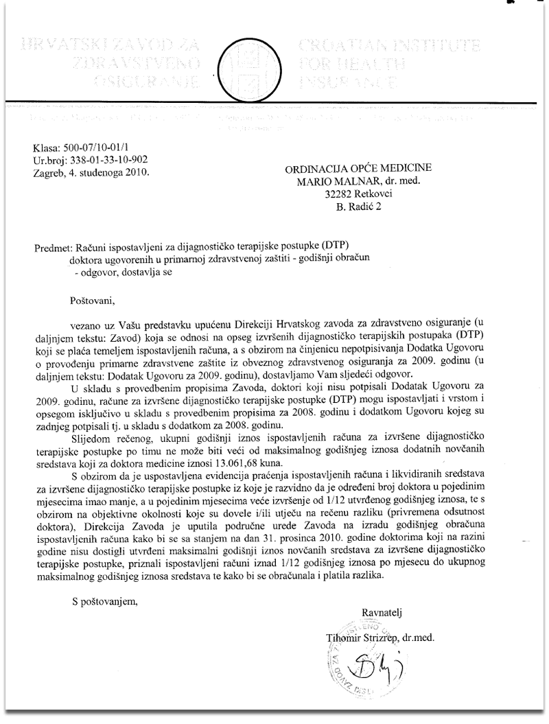 PS: Ma koliko kasno doslo, ipak smo mi u pravu. KoHOM i svi lijecnici pogodjeni pogresnim postupanjem Direkcije i PU HZZOa ovime dobijaju zadovoljstinu. U kratkim crtama, PUi HZZOa nisu smjeli samostalno smanjivati mjesecni iznos isplate DTPa na 1/12 ugovorenog iznosa za godinu jer je to protivno ugovorima koje imamo.